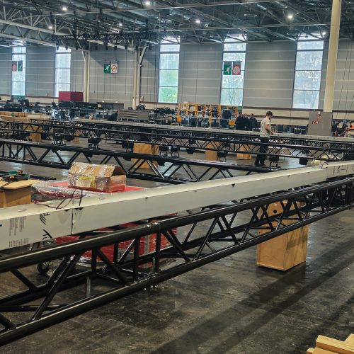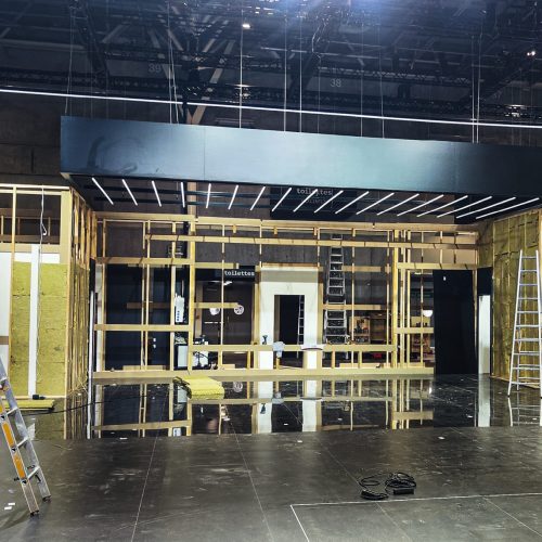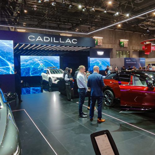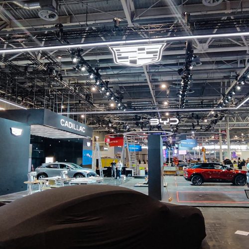 The stand concept combined glossy and matte black surfaces, creating a clear visual contrast and reinforcing the premium look of the vehicle presentation. The high-gloss main platform and surrounding matte elements were executed with precise transitions between materials, complemented by accent lighting to highlight key areas.