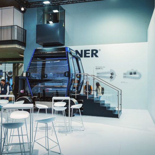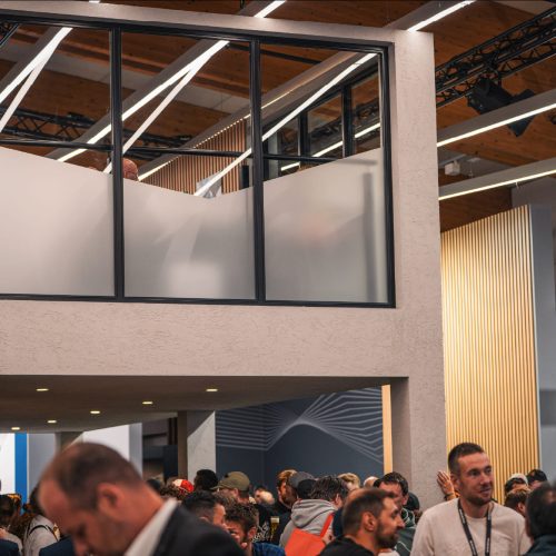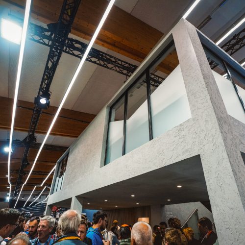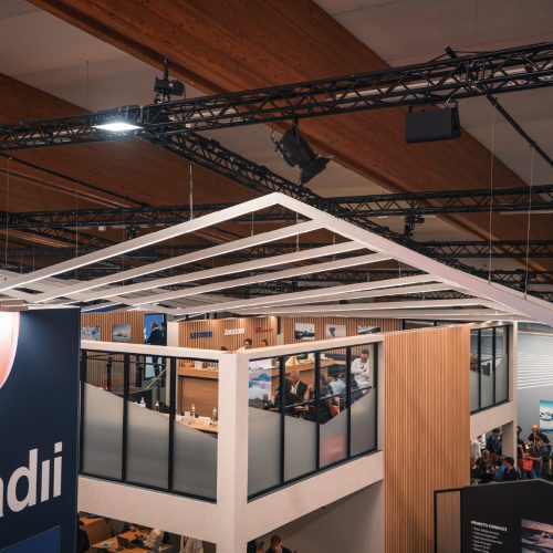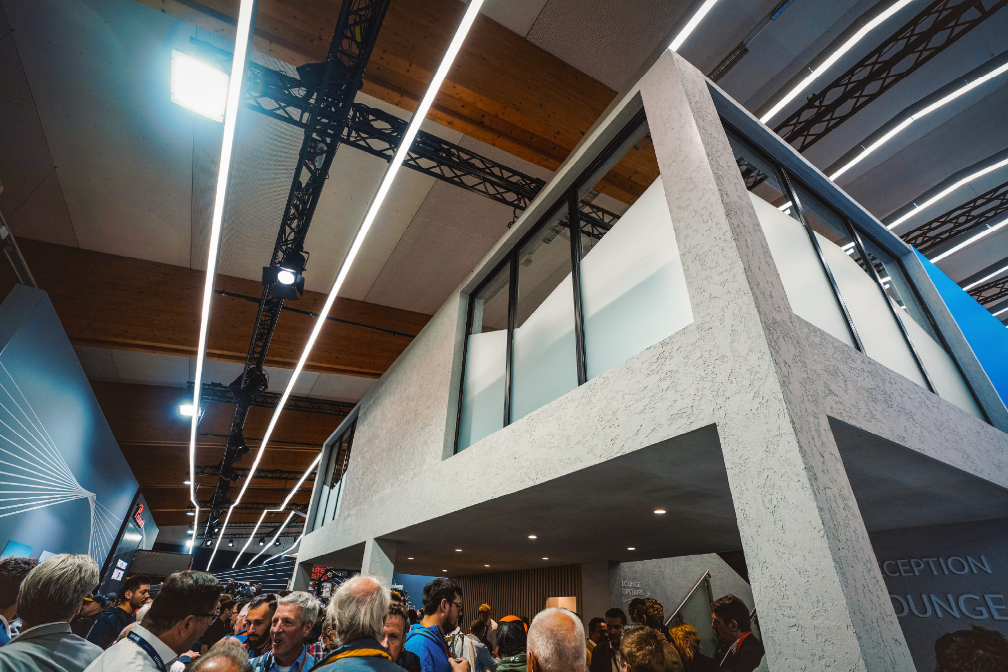 A central component of the stand was the shared hospitality area, designed to host informal meetings and exchanges between visitors and brand representatives. Its main feature was a two-storey structure housing a VIP lounge, providing an elevated setting for high-level discussions. The use of high-quality materials, particularly concrete surfaces with precise finishes, reinforced the premium character of the space and set a clear standard for the overall exhibition environment.