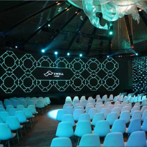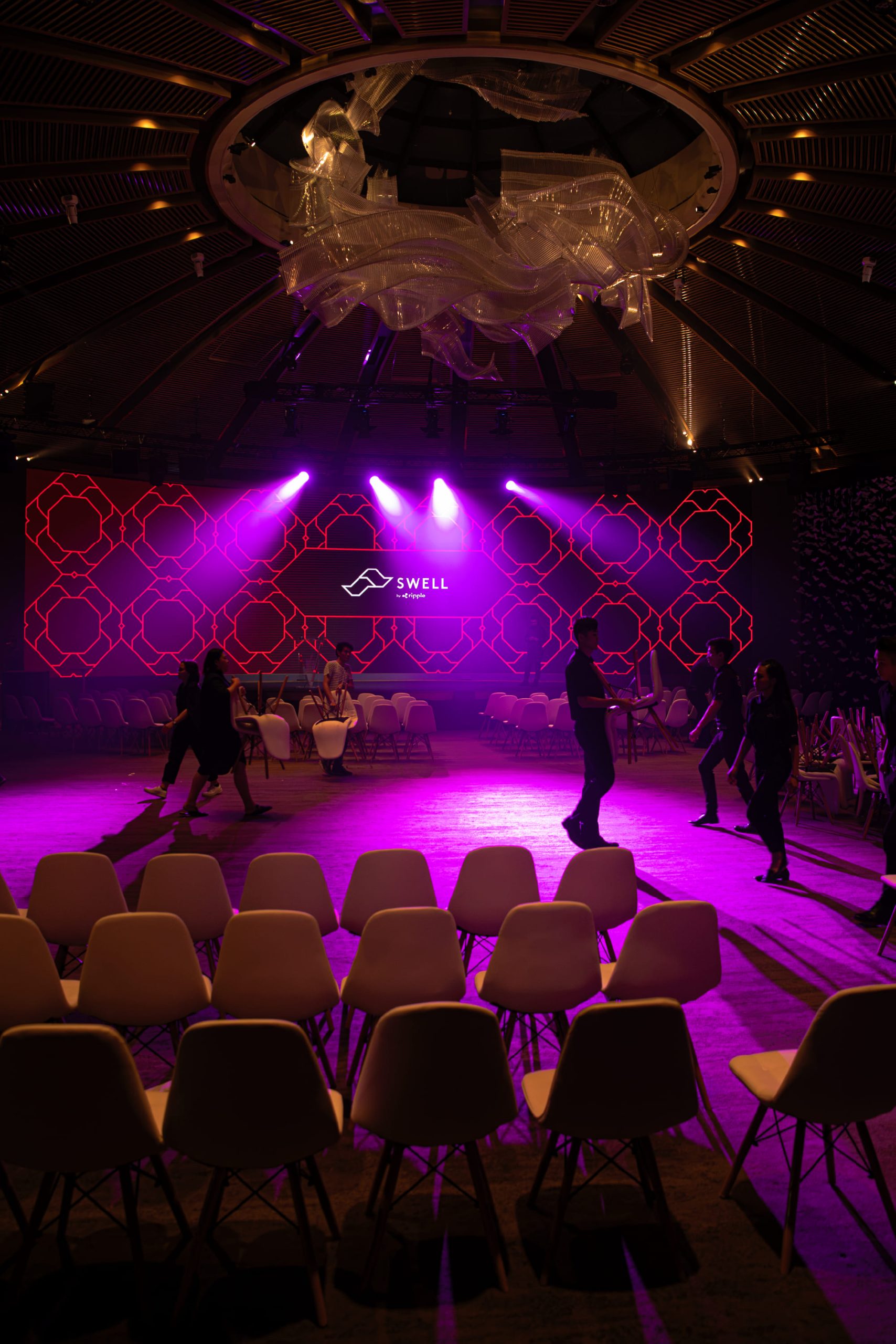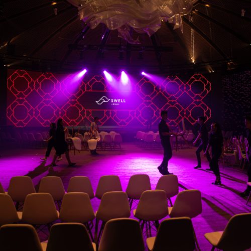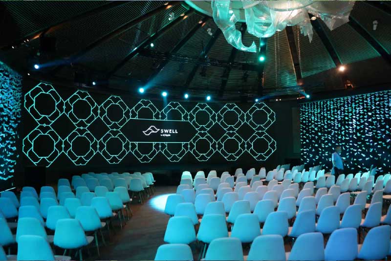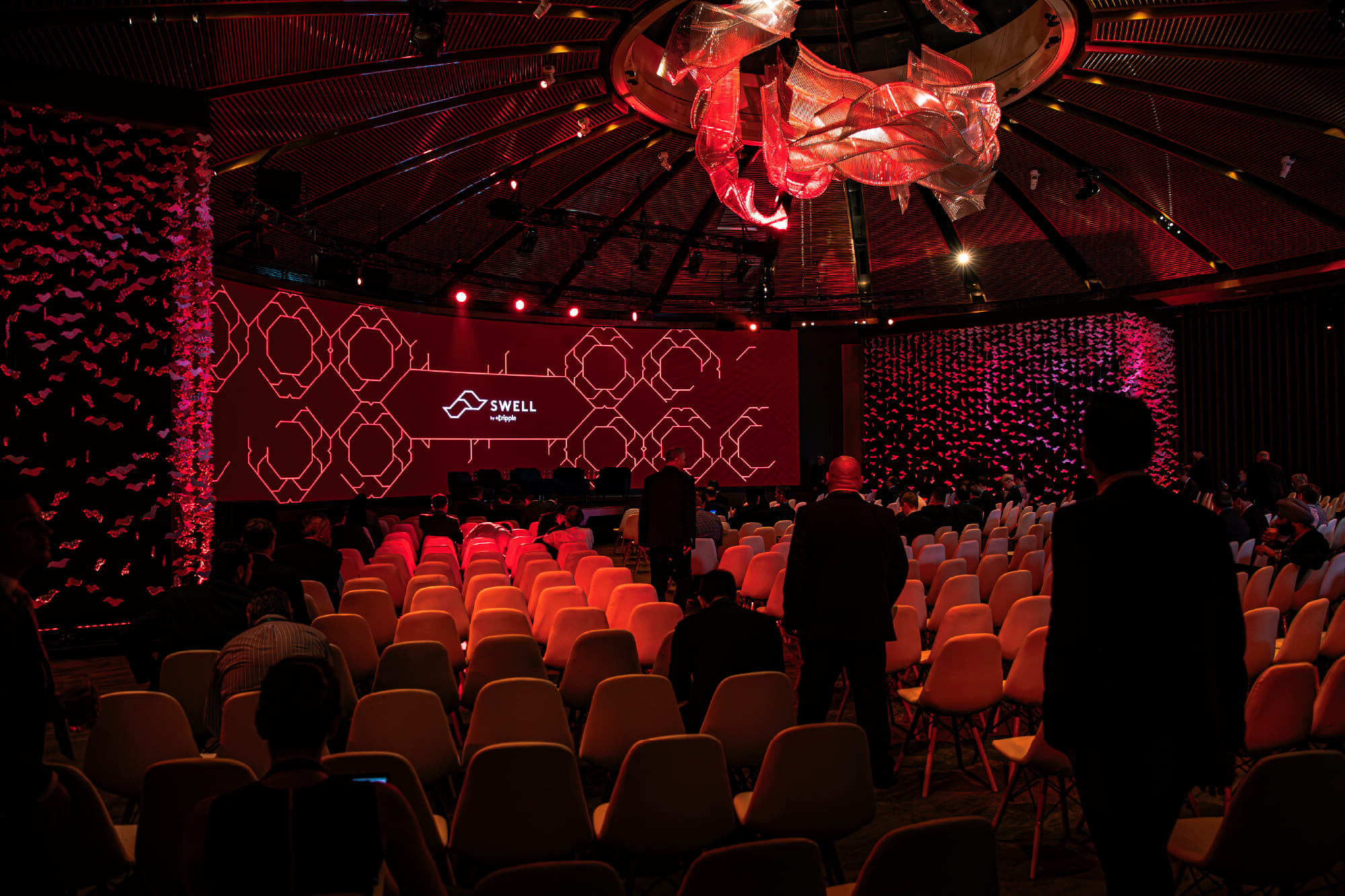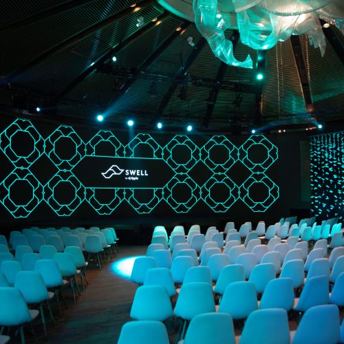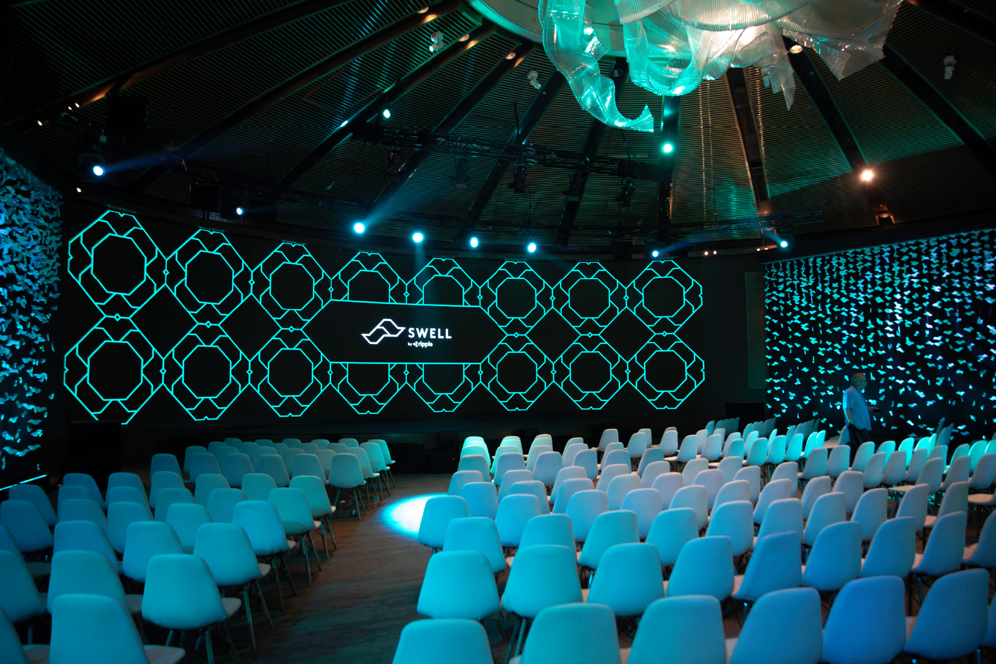 To bring this to life, the event design fused architectural precision with creative storytelling. Guests entered through a lush living wall and anamorphic installations spelling out the words “HELLO” and “SWELL,” leading to a kaleidoscopic passageway that revealed the main space. Interactive zones invited exploration – from infographic walls visualizing the RippleNet network to demo kiosks and partner showcases.