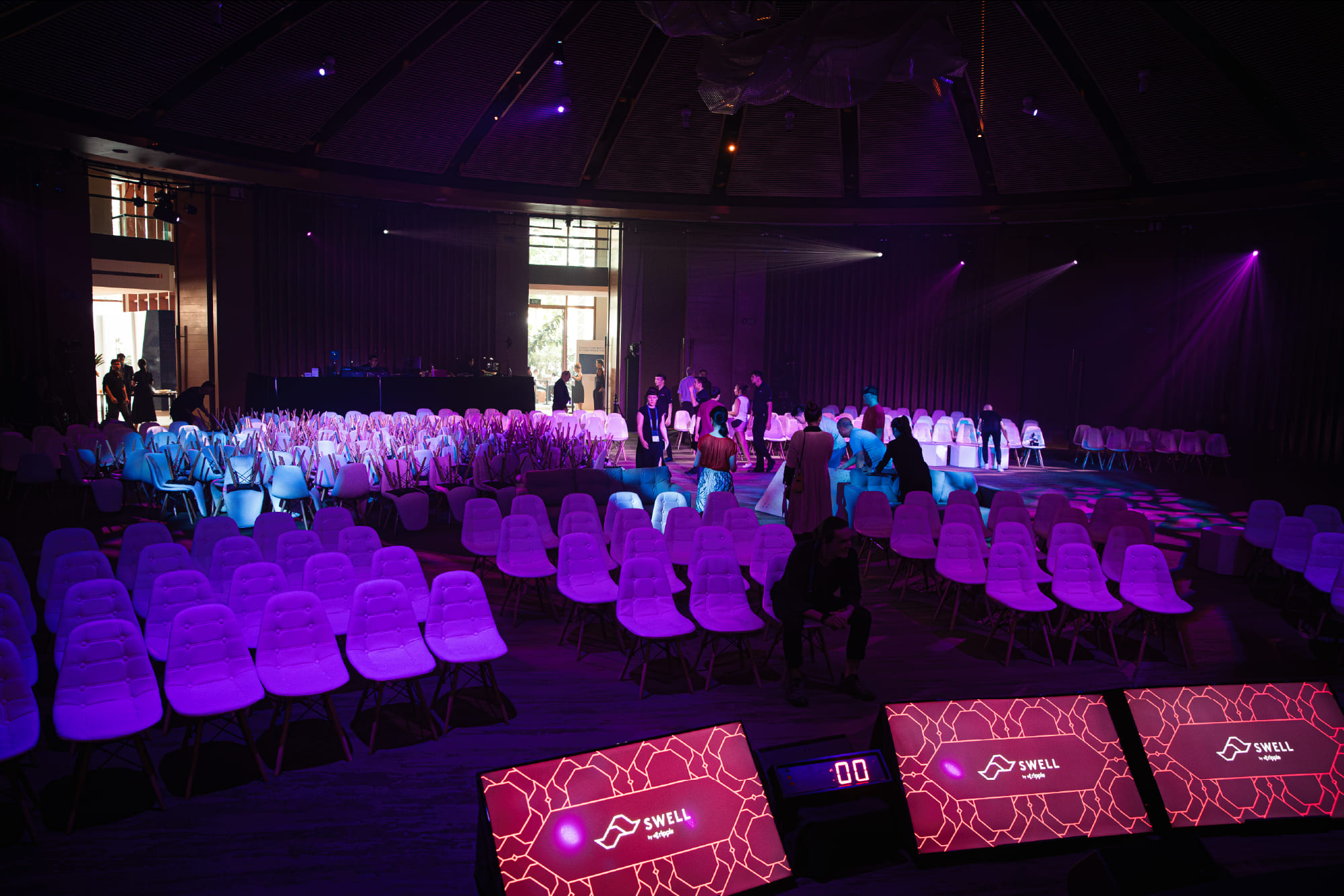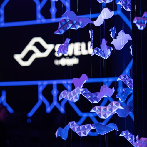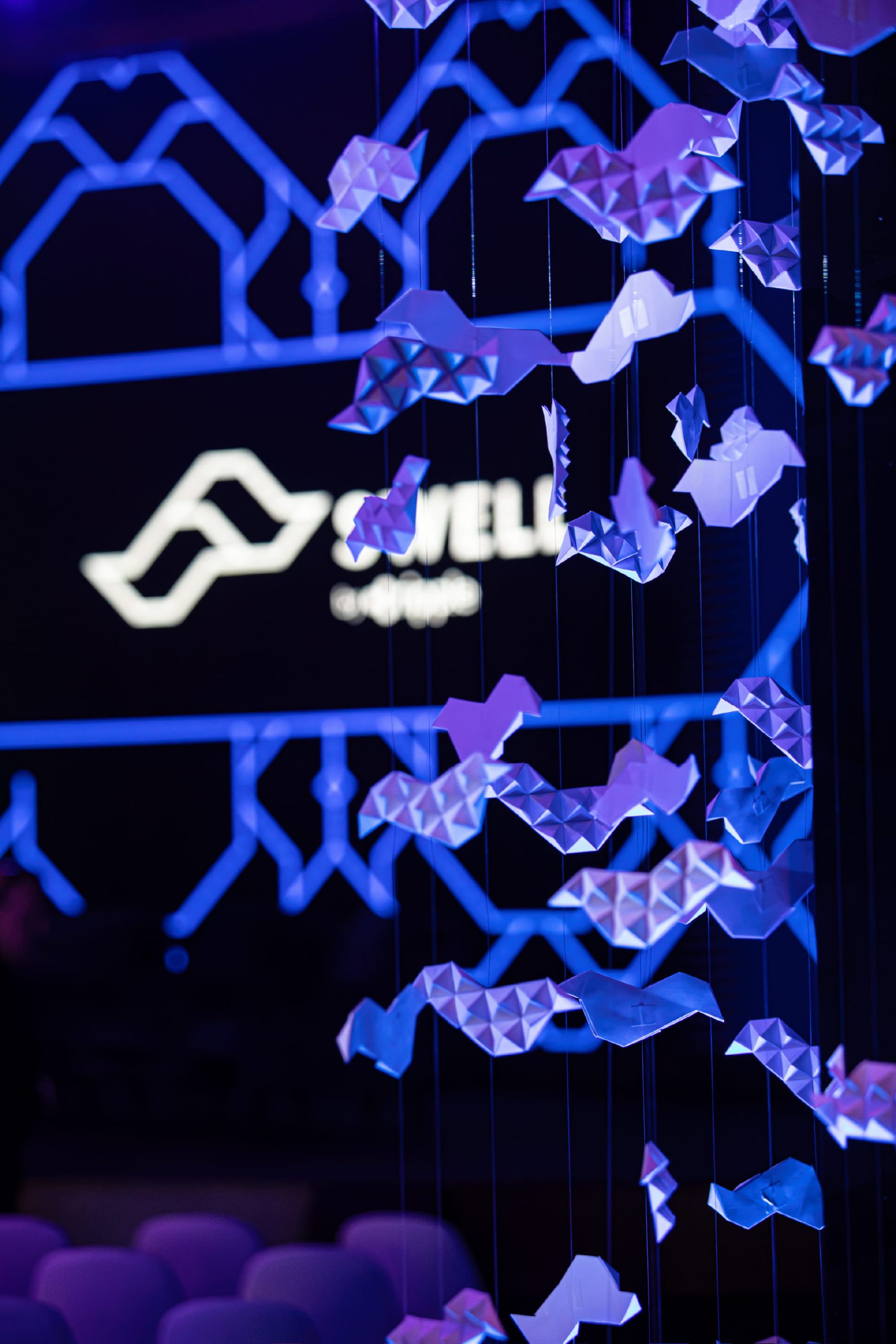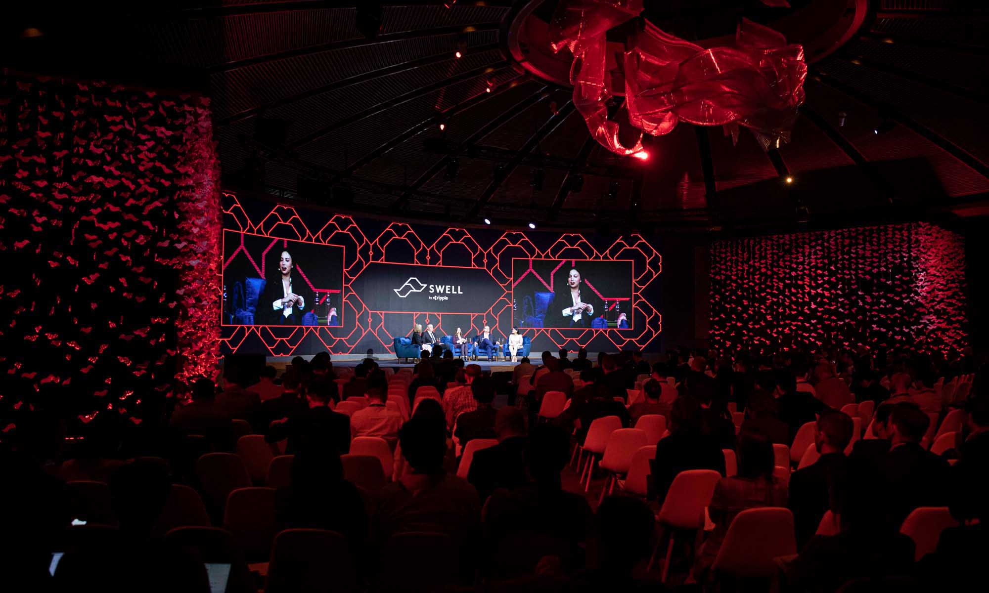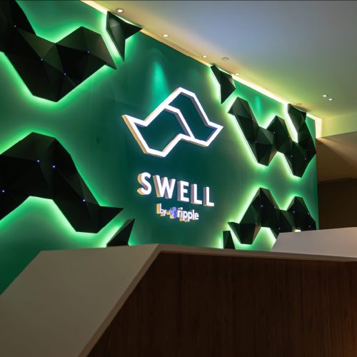 To bring this to life, the event design fused architectural precision with creative storytelling. Guests entered through a lush living wall and anamorphic installations spelling out the words “HELLO” and “SWELL,” leading to a kaleidoscopic passageway that revealed the main space. Interactive zones invited exploration – from infographic walls visualizing the RippleNet network to demo kiosks and partner showcases.