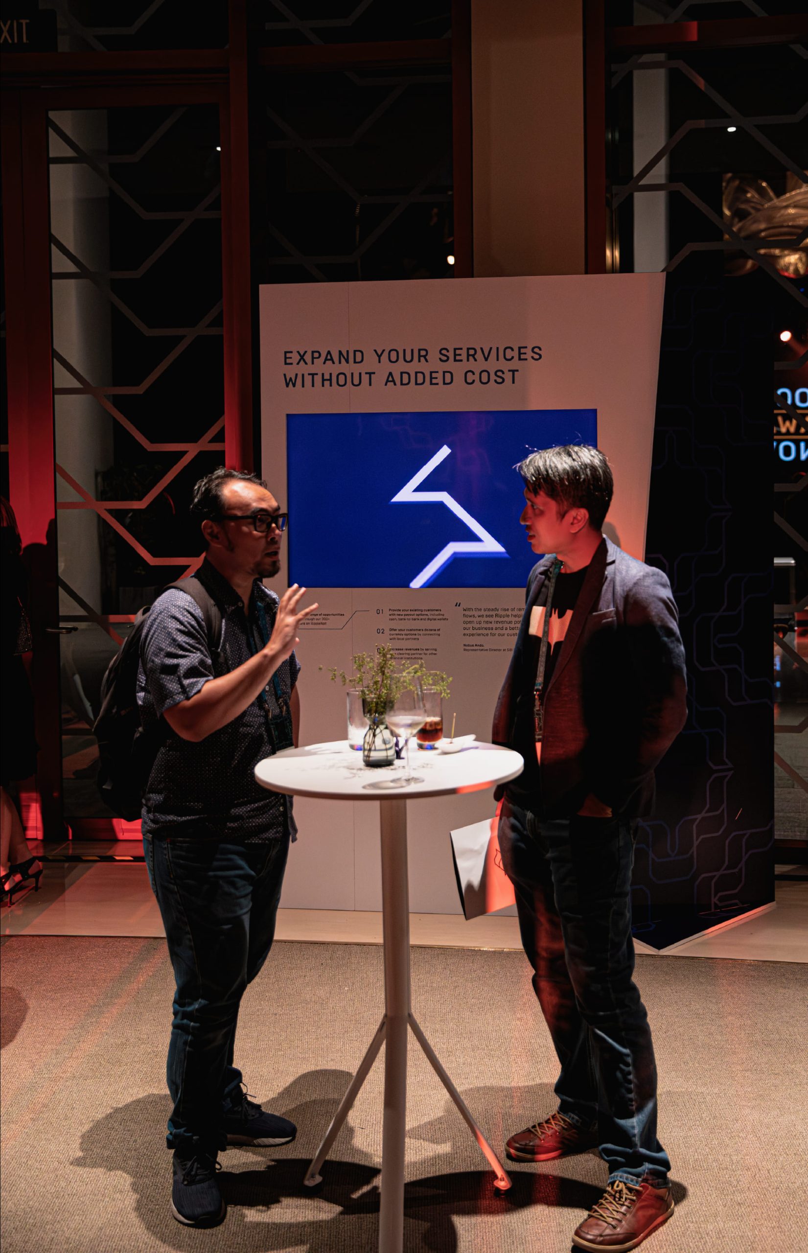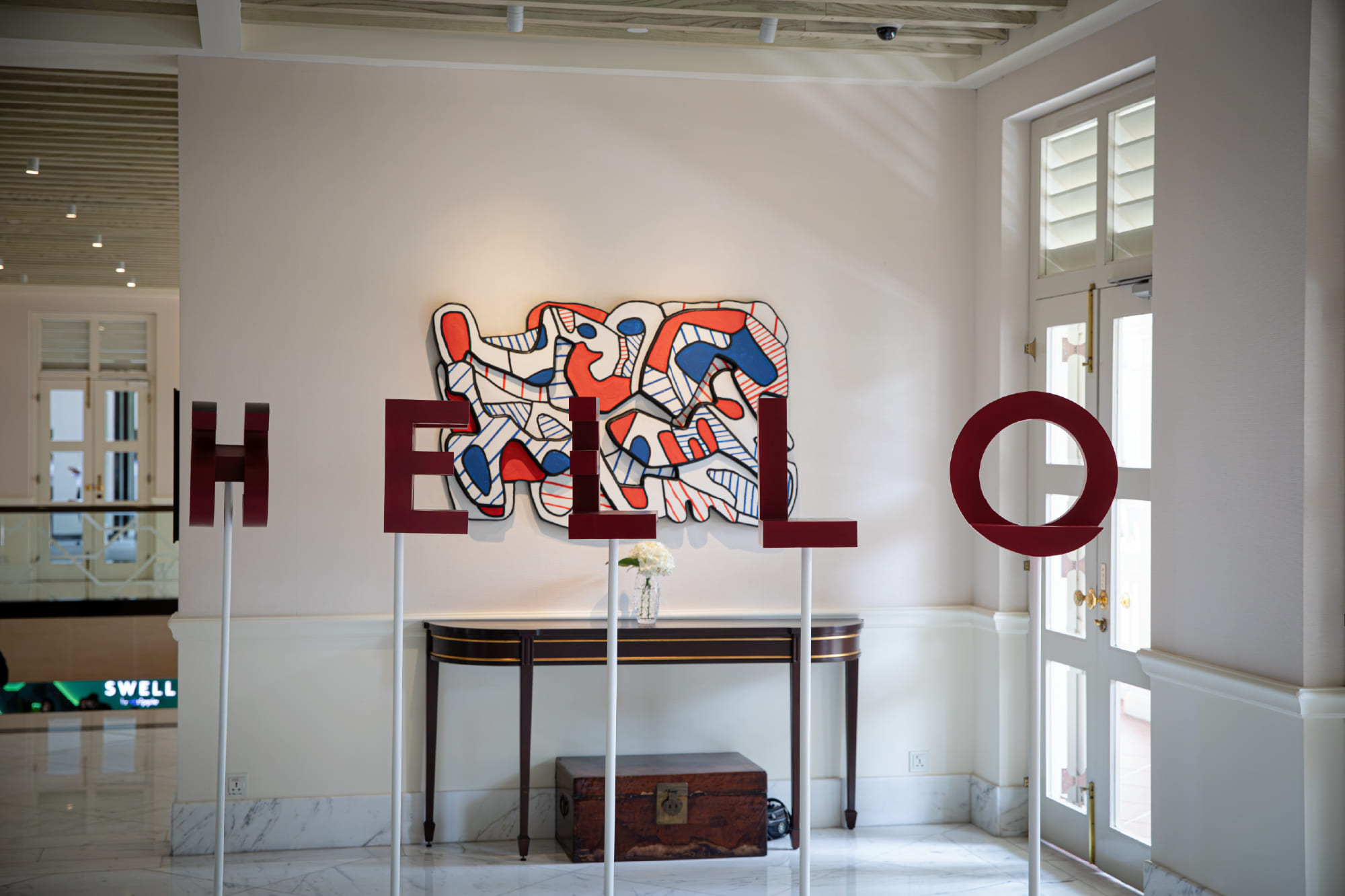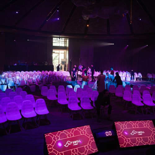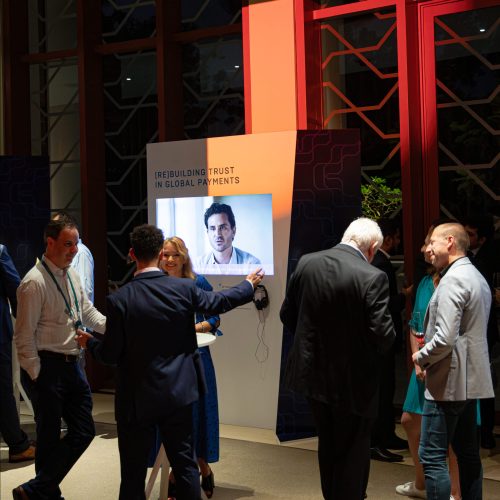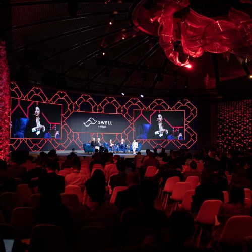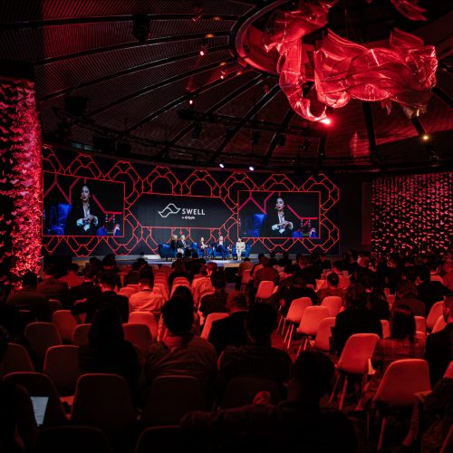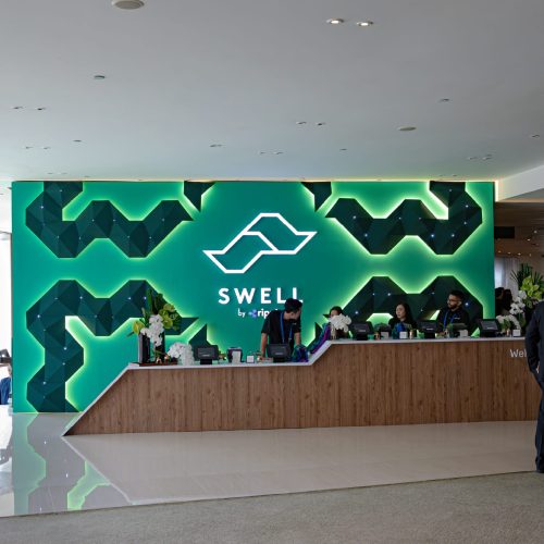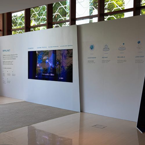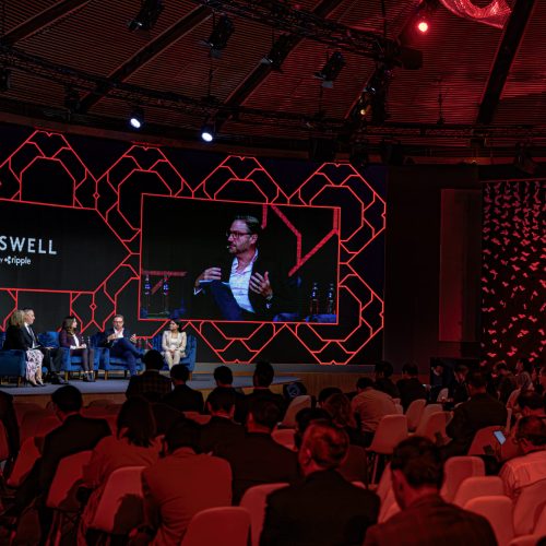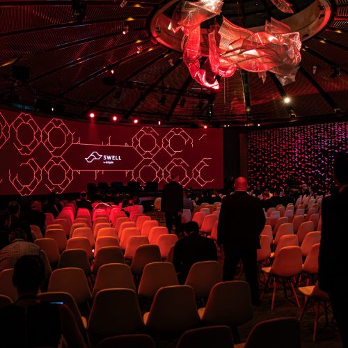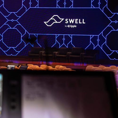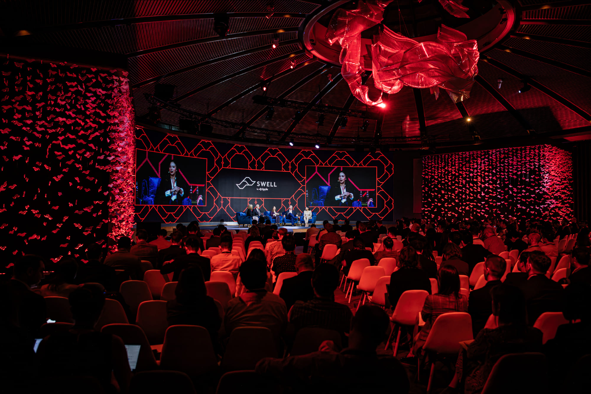 To bring this to life, the event design fused architectural precision with creative storytelling. Guests entered through a lush living wall and anamorphic installations spelling out the words “HELLO” and “SWELL,” leading to a kaleidoscopic passageway that revealed the main space. Interactive zones invited exploration – from infographic walls visualizing the RippleNet network to demo kiosks and partner showcases.