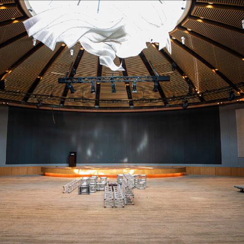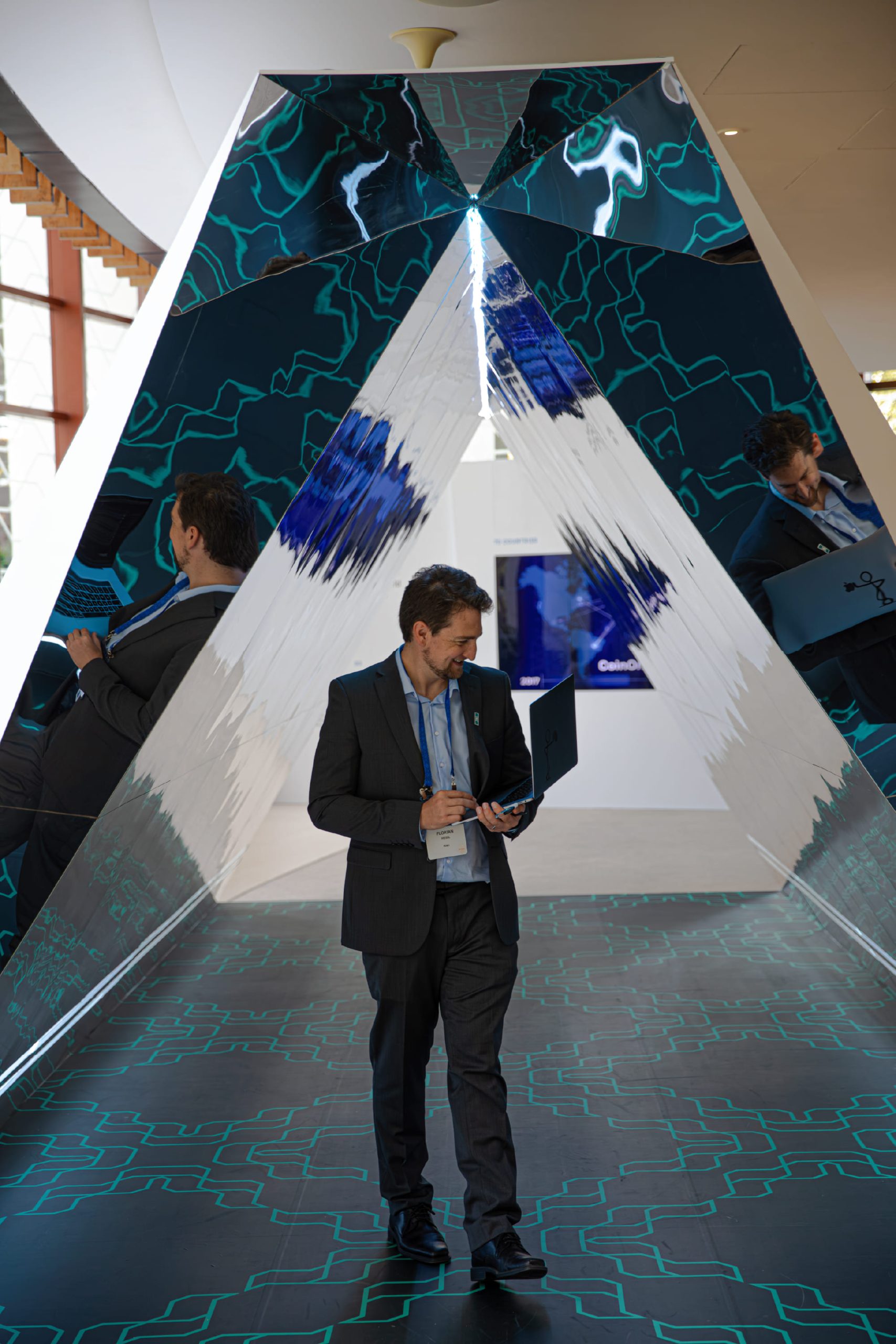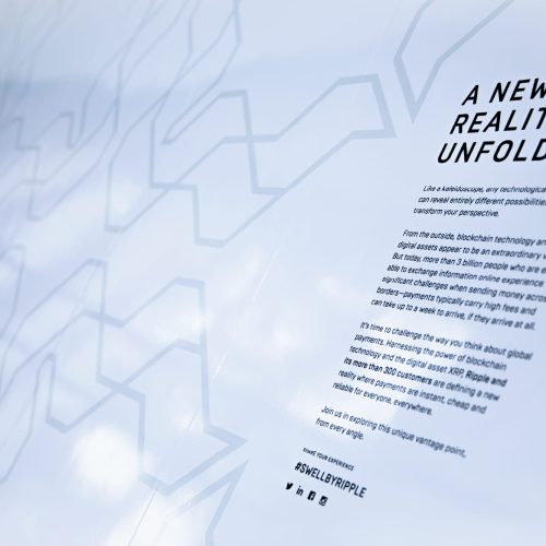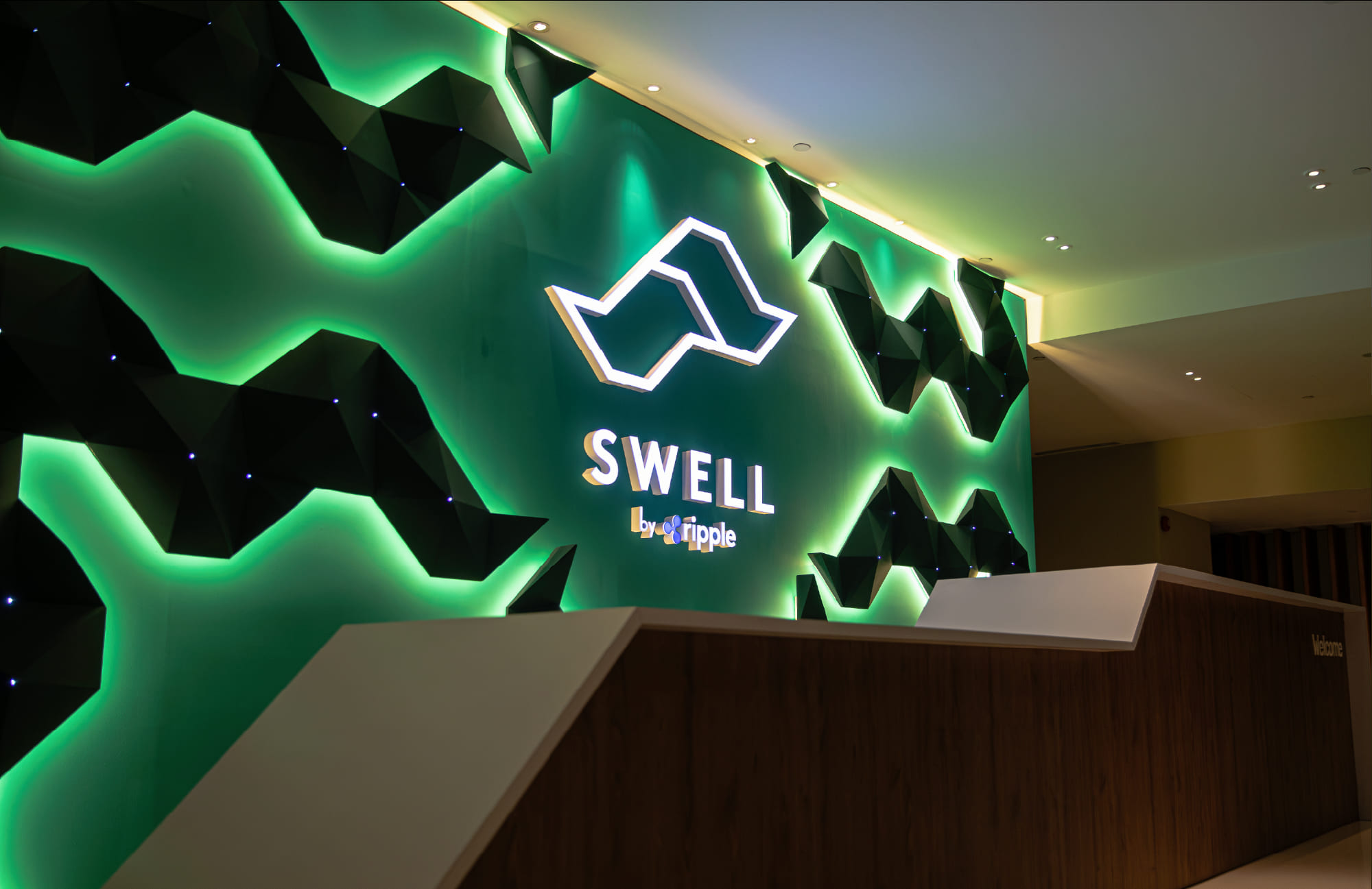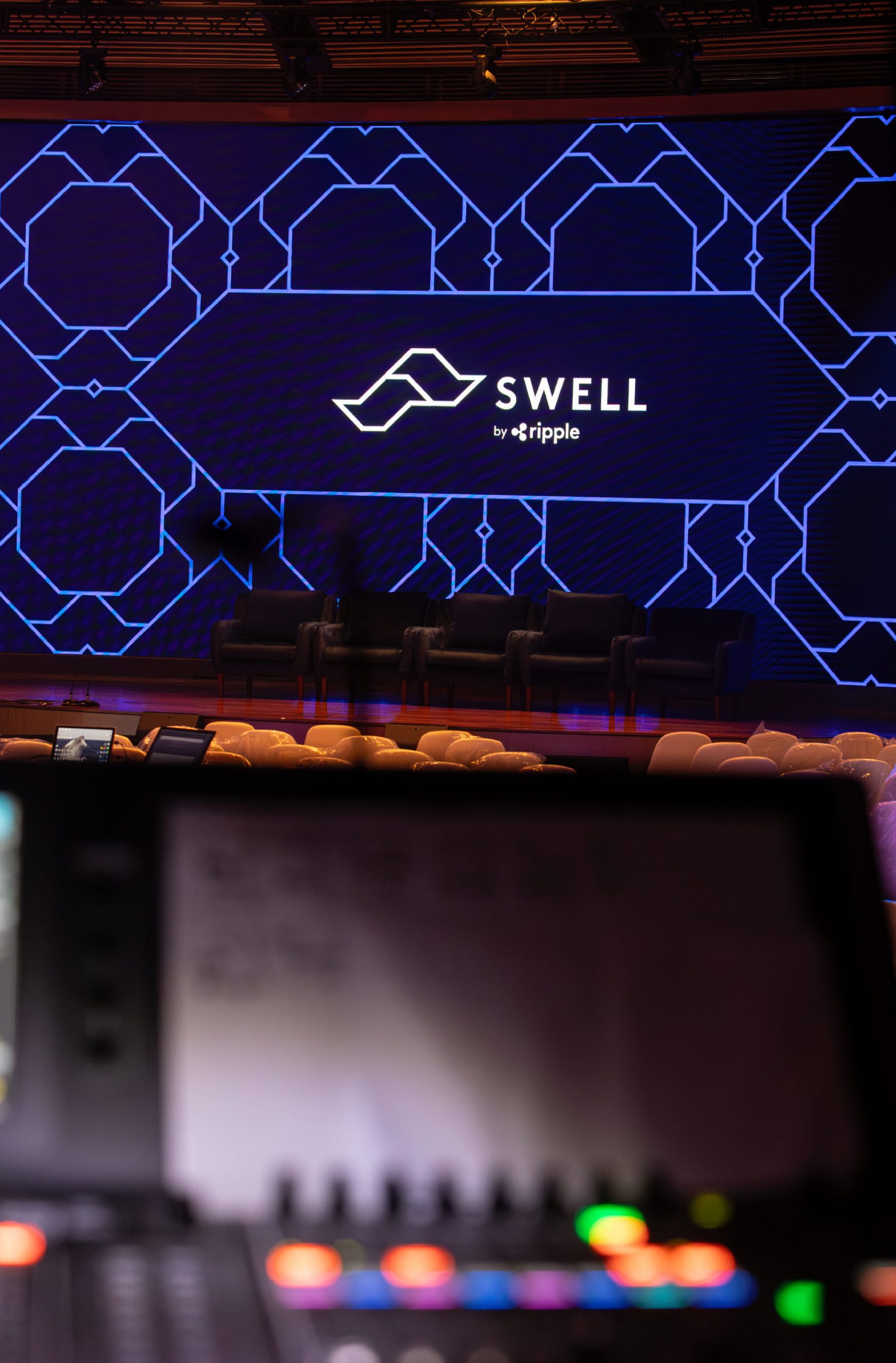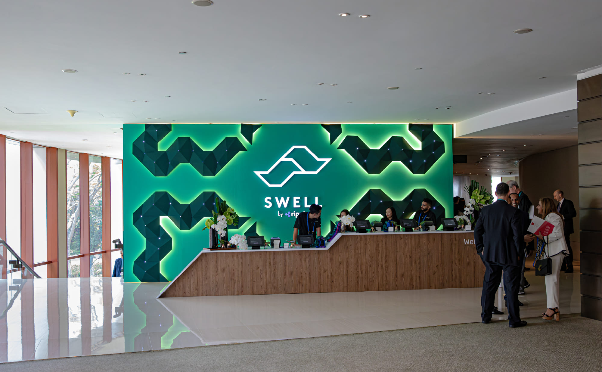 At the center of the experience, two giant origami tents made from over 6,000 hand-folded Swell logos framed the stage, illuminated by iridescent colors during keynote speeches. The cohesive tessellation-inspired identity extended to signage, digital media, and installations, creating a seamless visual language that reflected Ripple's unity and forward-thinking spirit.